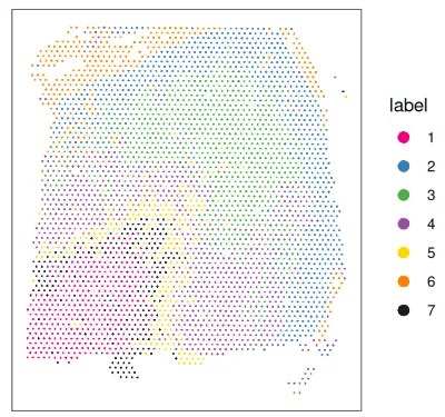 接下来,我们应用聚类算法以识别细胞类型或空间域。请注意,在此示例中,我们仅使用分子特征(基因表达)作为聚类的输入。
