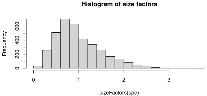 hist(sizeFactors(spe), breaks = 20, main = "Histogram of size factors")
