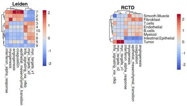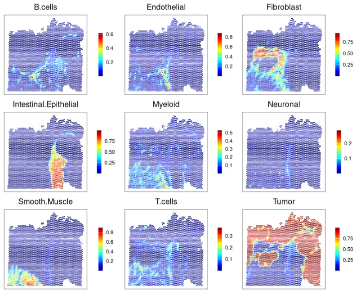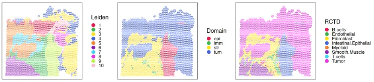 为了帮助表征来自无监督聚类的亚群,我们可以查看它们在基于去卷积的聚类和广泛区域中的分布;例如,肿瘤 spot 非常多样,而平滑肌 spot 和(正常)上皮几乎完全映射到单一聚类: