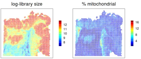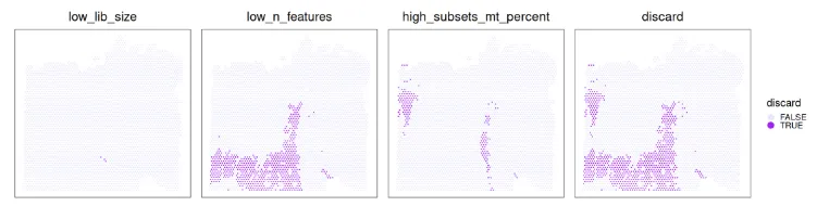 看起来低质量 spot 在空间上高度有序,因此暂时不要移除它们。我们将在下方进一步看到,这里使用的质量控制指标,以及被认为应丢弃的 spot,在(基于转录组的)cluster 中是如何分布的。