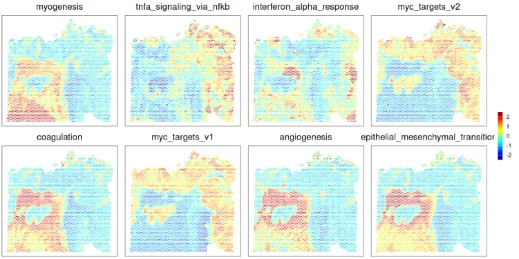 接下来,我们将用 AUCell(Aibar et al. 2017)来打分,它分两步走:(i) 对每个观测(这里是 spot)里的基因进行排序,(ii) 为每个基因集计算 AUC 值。本质上,这些值代表“在排名最靠前(默认前 5 %)的基因里,属于该基因集的比例”;也就是说,数值越高,(协同基因表达所体现的)活性越高。