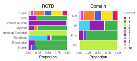 ggplot(df, aes(Freq, RCTD, fill=Leiden)) + ggtitle("RCTD") +