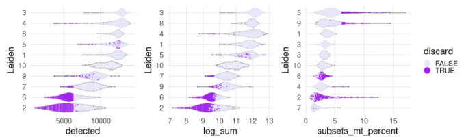 plotColData(spe, x=., y="Leiden", color_by="discard", point_size=0.1) +