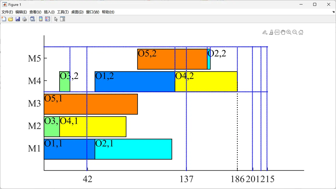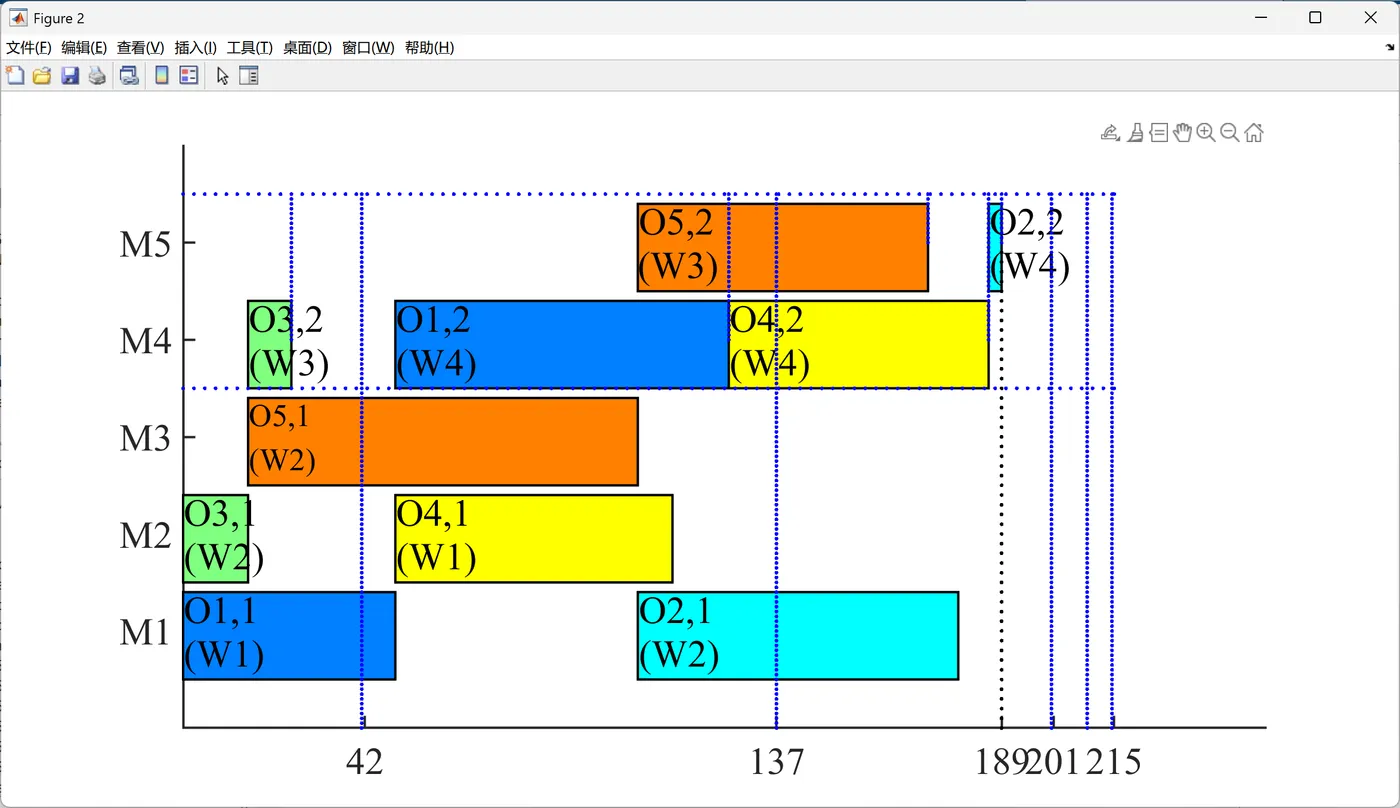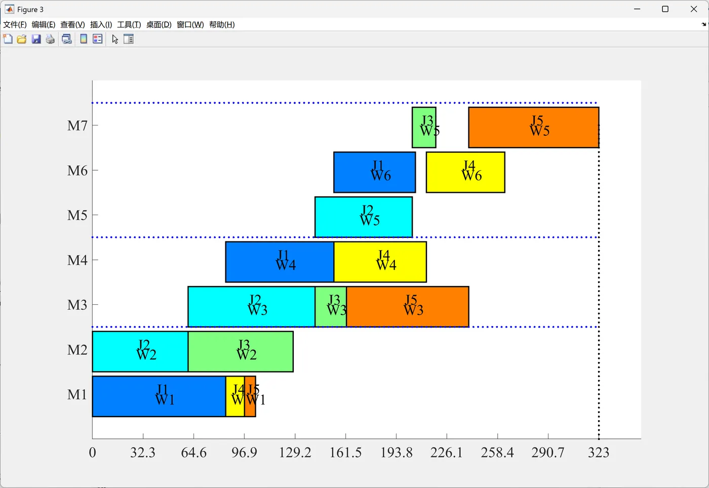 %绘制甘特图 solution=1; load resultt01100×2I_all.mat load AAA_t01100×2.mat chrom_decode_one=Population_child_all(solution).decode; total_ope_num=size(chrom_decode_one,1); %% 画甘特图 col=jet(job_num); %机器颜色的设定 rec=zeros(1,4); for i=1:total_ope_num job_rank=chrom_decode_one{i,1}(1,1); %取出工件号 ope_rank=chrom_decode_one{i,1}(1,2); %取出工序号 ma_rank=chrom_decode_one{i,1}(1,3); %取出机器号 wo_rank=chrom_decode_one{i,1}(1,4); %取出工人号 ST_ope=chrom_decode_one{i,1}(1,6); %取出该工序开始加工时间 CT_ope=chrom_decode_one{i,1}(1,7); %取出该工序结束加工时间 rec(1)=ST_ope; %矩形的横坐标 rec(2)=ma_rank-0.5; %矩形的纵坐标 rec(3)=CT_ope-ST_ope; %矩形的x轴方向的长度 rec(4)=0.9; rectangle('Position',rec,'LineWidth',1.5,'LineStyle','-','FaceColor',col(job_rank,:)); %draw every rectangle text(rec(1)+rec(3)*0.5-2,ma_rank+rec(4)/4,strcat('O',num2str(job_rank),',',strcat(num2str(ope_rank))),'fontsize',10); text(rec(1)+rec(3)*0.5-2,ma_rank-rec(4)/4,strcat('(','W',num2str(wo_rank),')'),'fontsize',10); end makespan=Population_child_all(solution).objectives(1); chrom_ma=Population_child_all(solution).chromesome(total_ope_num+1:2*total_ope_num); Machine_number=max(mach_set_stage{1,stage_num}); mach_info=cell(1,Machine_number); %存储字符串变量,机器 for i=1:Machine_number num=i; str1='M'; str=sprintf('%s%d',str1,num); mach_info{1,i}=str; end y=1:Machine_number; x=0:0.1*makespan:makespan*1.001; set(gca,'YTick',y); %设置y坐标轴的范围 set(gca,'XTick',x); set(gca,'YTickLabel',mach_info); set(gca,'FontName','Times New Roman','FontSize',10); %% 做出makespan所在线 hold on x1=makespan; y=0:0.1:Machine_number; plot(x1,y,'k.-'); hold on x2=0:3:makespan; y=zeros(1,stage_num); for i=1:stage_num num=size(mach_set_stage{1,i},2); y(1,i)=mach_set_stage{1,i}(1,num)+0.5; plot(x2,y(1,i),'b.-'); end %绘制解的分布图 load resultt01100×2I_all.mat [~,col]=find([Population_child_all.rank]==1); [~,col1]=size(col); y_f1=zeros(1,col1); y_f2=zeros(1,col1); y_f3=zeros(1,col1); for i=1:col1 y_f1(1,i)=Population_child_all(col(i)).objectives(1); y_f2(1,i)=Population_child_all(col(i)).objectives(2); end plot(y_f1,y_f2,'og'); xlabel('makespan'); ylabel('Total tradiness of all jobs');