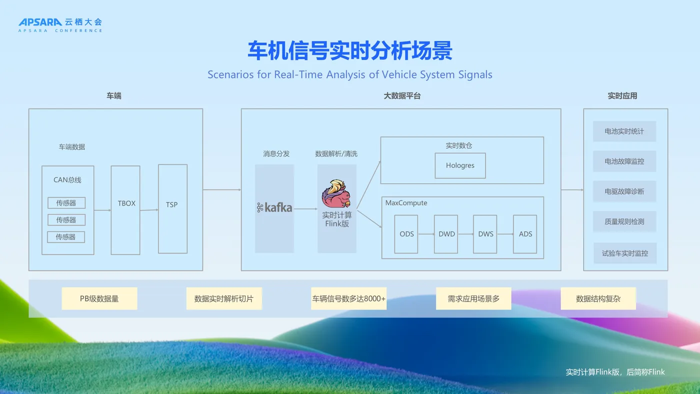 在数据流转过程中,面临着多重挑战。数据量巨大,目前已达PB级规模;大多数应用场景下,需要对信号数据进行实时切片处理;信号数量众多,高端车型的信号数远超8000个;需求应用场景繁多;数据结构极为复杂。