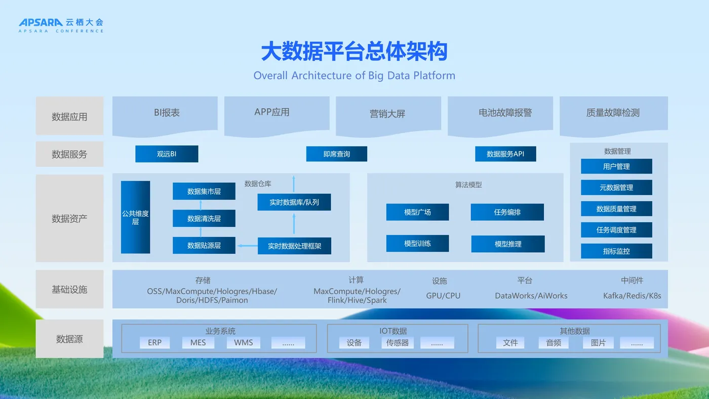 最上层是数据应用层,包括观远BI、APP应用、营销大屏、电池故障报警、质量故障检测等多种应用场景,真正实现了数据价值的释放。
