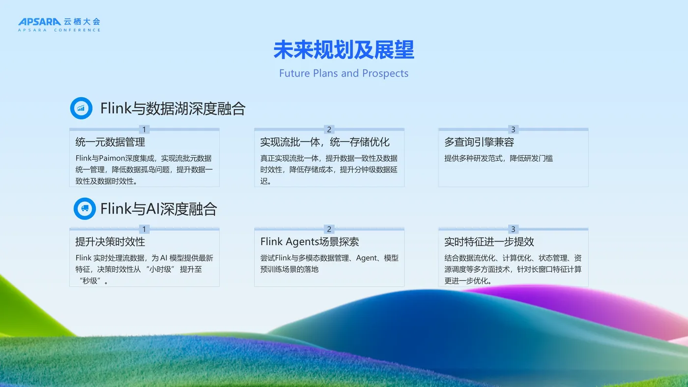 Flink与AI的深度融合是第二个方向,主要包括三个方面。提升决策时效性,通过Flink实时处理流数据,为AI模型提供最新特征,将决策时效性从小时级提升至秒级。探索Flink Agents场景,尝试Flink与多模态数据管理、Agent、模型预训练场景的落地,同时提供多种研发范式,降低研发门槛。构建实时特征计算平台,结合数据流优化、计算优化、状态管理、资源调度等多方面技术,针对长窗口特征计算进行进一步优化,提升实时特征计算的效率。