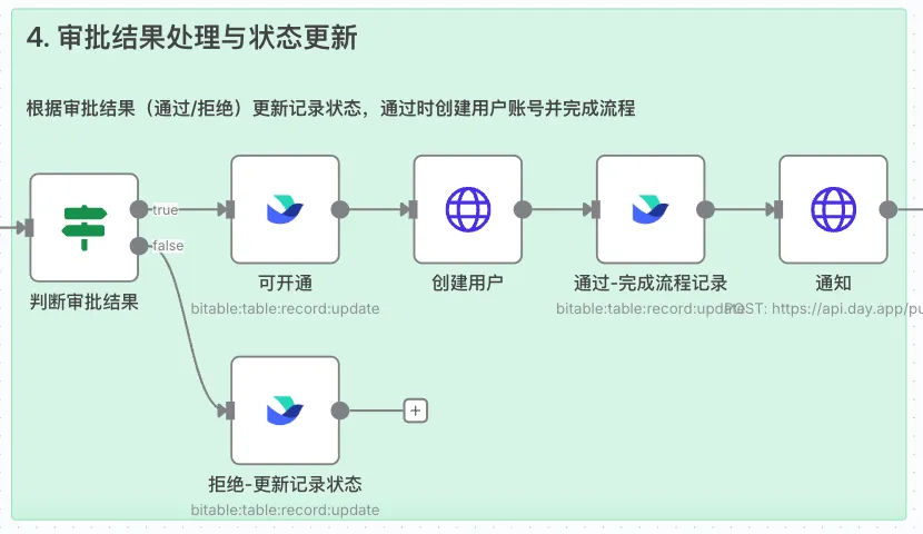 - 通过并记录 → 更新多维表格状态为"已申请",并记录开通时间