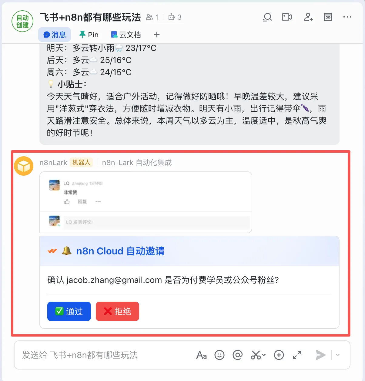 🔔 n8n Cloud 自动邀请 确认 lunaraitalk@163.com 是否为付费学员或公众号粉丝? ✅ 通过 ❌ 拒绝