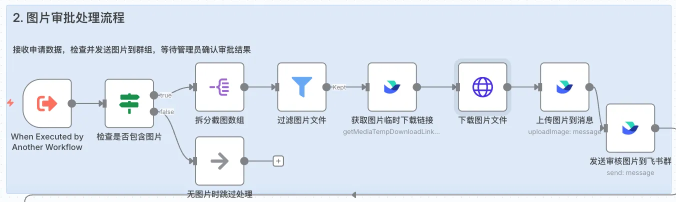 - 检查是否包含图片 → 如果没图片, 跳转到"无图片时跳过处理"节点,直接结束(不发送审批请求)
