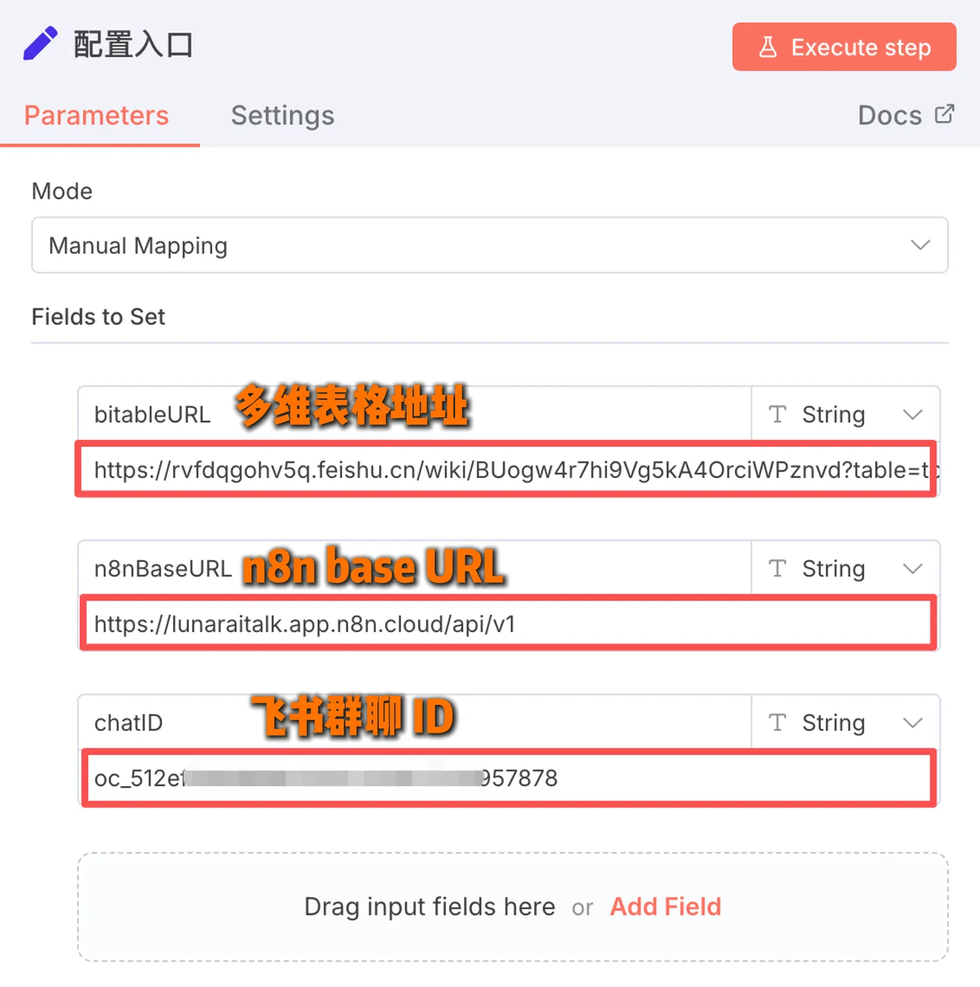 手动触发节点,用来测试或手动执行整个流程,配置入口里填上以下信息。