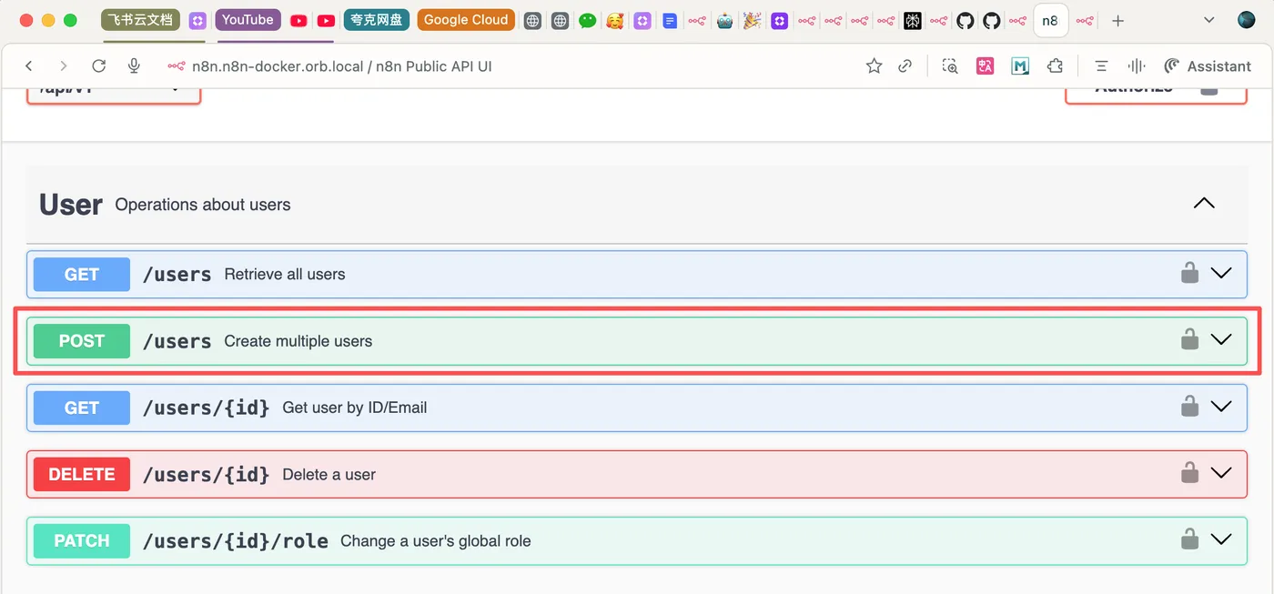 我打开 n8n 的文档,果然在 API 页面找到了 POST /users 接口: