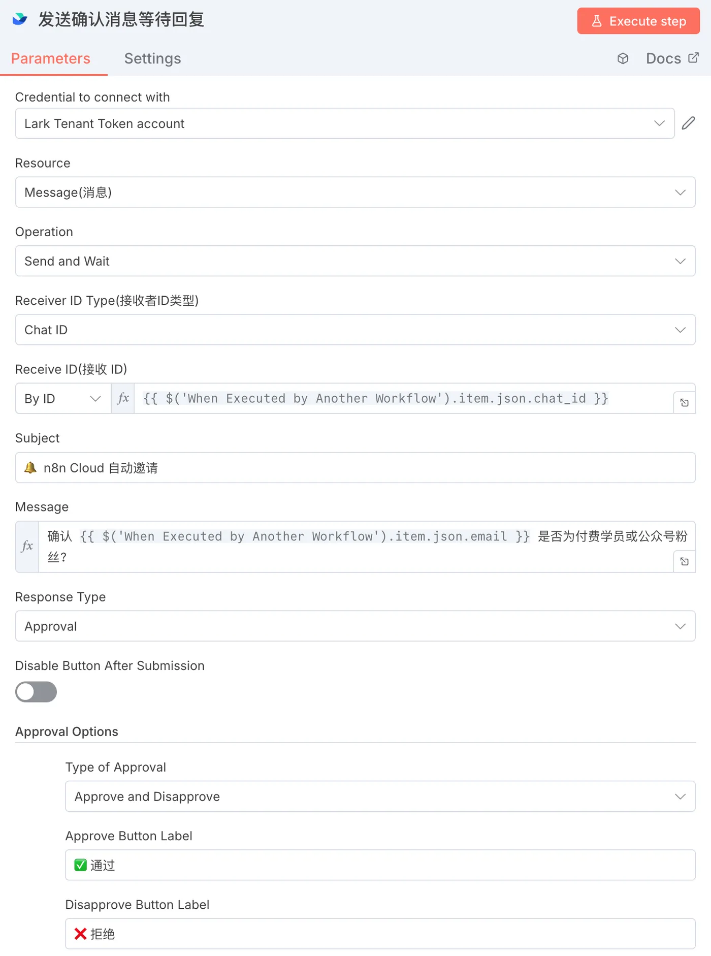 Type of Approval: Approve and Disapprove (提供"通过"和"拒绝"两个按钮) Approve Button Label: ✅ 通过 Disapprove Button Label: ❌ 拒绝