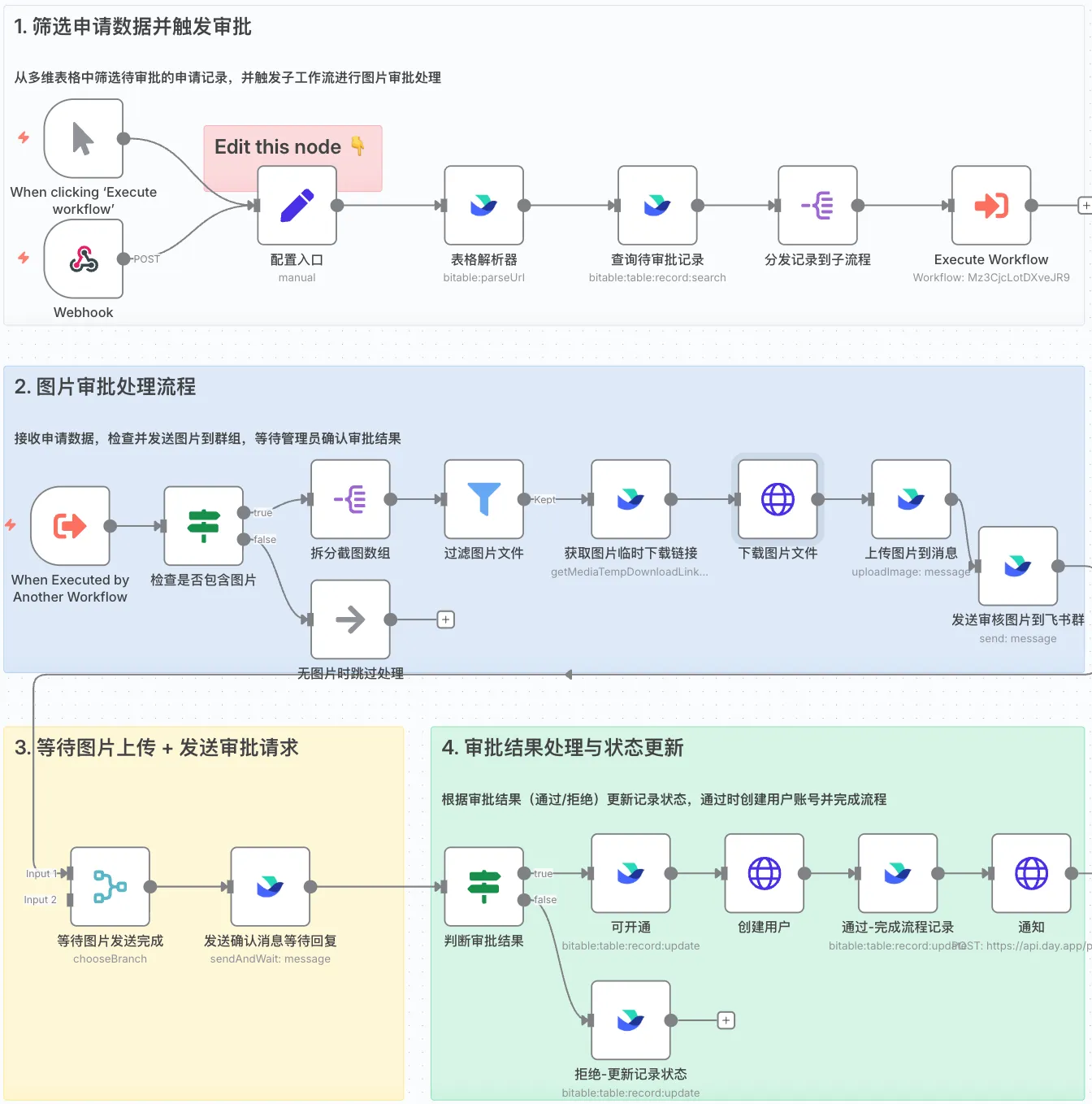主流程负责数据筛选和分发,子流程负责具体的审批处理。虽然节点很多,但我按功能做了模块化分区,用不同颜色的便签纸包裹起来,这样一眼就能看清楚每个模块在干什么。
