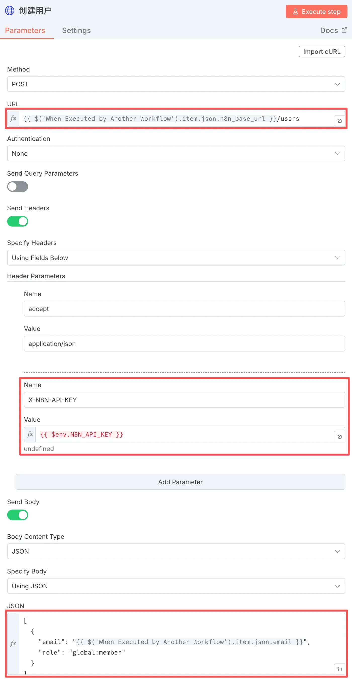 n8n_base_url: 你的 n8n 实例地址(比如https://your-n8n.com/api/v1)N8N_API_KEY: 在 n8n 后台生成的 API Keyemail: 从主流程传过来的用户邮箱role: 用户角色,这里设置为global:member(普通成员)