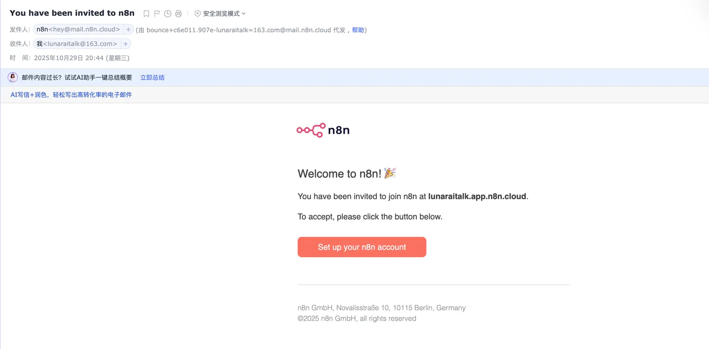 成功后,n8n 会自动发送邀请邮件给用户,用户点击链接就能激活账号。