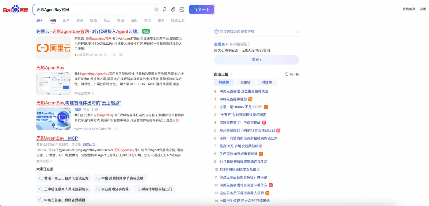 - 百度搜索结果页截图 - 展示了搜索"无影AgentBay官网"后的结果页面