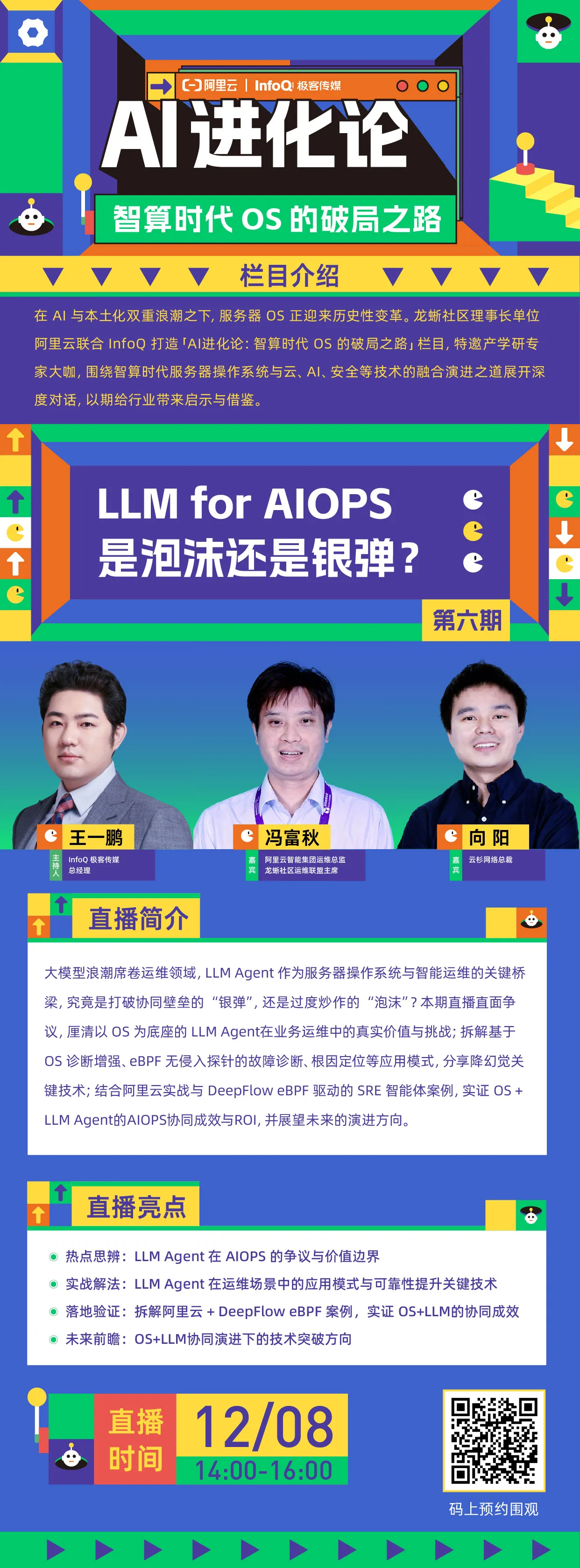 当大模型浪潮席卷运维领域,LLM Agent 被寄予厚望——它究竟是解决复杂运维难题的“银弹”,还是被过度炒作的“泡沫”?《AI 进化论:智算时代操作系统的破局之路》系列直播第六期将于 12 月 8 日 14:00 开始,特别邀请到云杉网络总裁向阳,阿里云智能集团运维总监、龙蜥社区运维联盟主席冯富秋,InfoQ 极客传媒总经理、总编辑王一鹏三位嘉宾,围绕 “LLM for AIOPS,是泡沫还是银弹?” 这一主题展开深度探讨,聚焦 LLM Agent 在 AIOPS 中的真实价值与落地挑战,深入剖析其在故障诊断、根因分析、自动化响应等场景中的典型应用与常见误区;探讨如何通过提示工程、工具调用与反馈机制有效抑制幻觉,释放大模型在运维领域的潜力。
