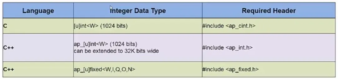 如在C++中,可以采用“ap_[u]int<W>”来定义一个W位宽的变量,其中[u]表示为无符号变量。