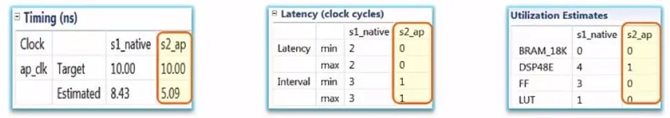 例子:对于一个18bit*18bit的乘法器,输入数据采用ap_int<18>,输出数据采用ap_int<36>。下图展示了采用传统C语言的数据类型方式(s1_native)和任意精度数据类型方式(s2_ap)的HLS编译结果。