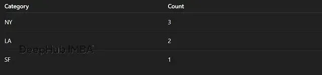 "city": ["NY", "LA", "NY", "SF", "LA", "NY"],