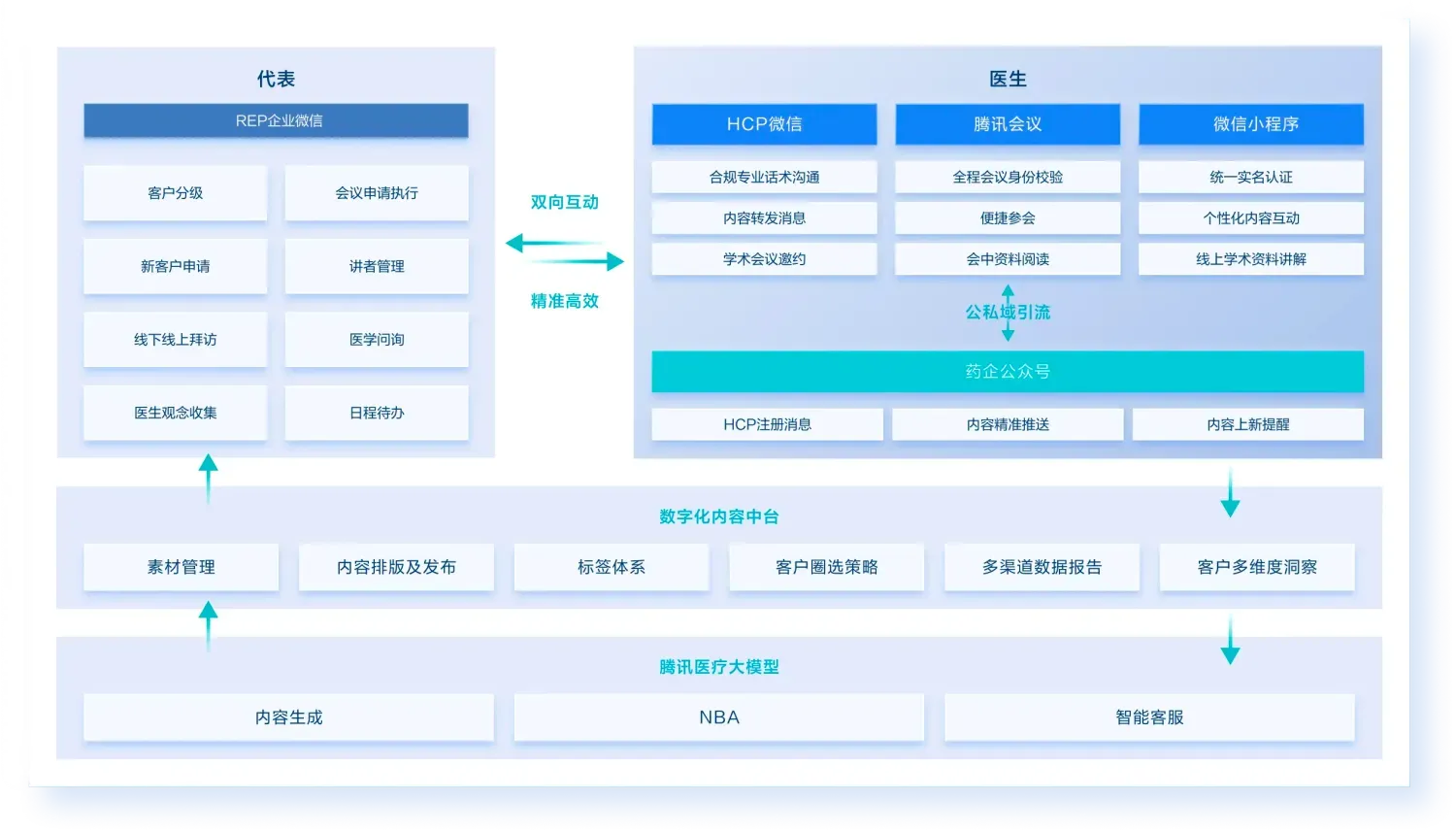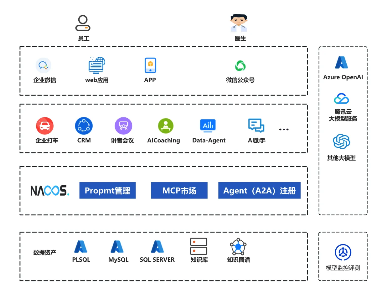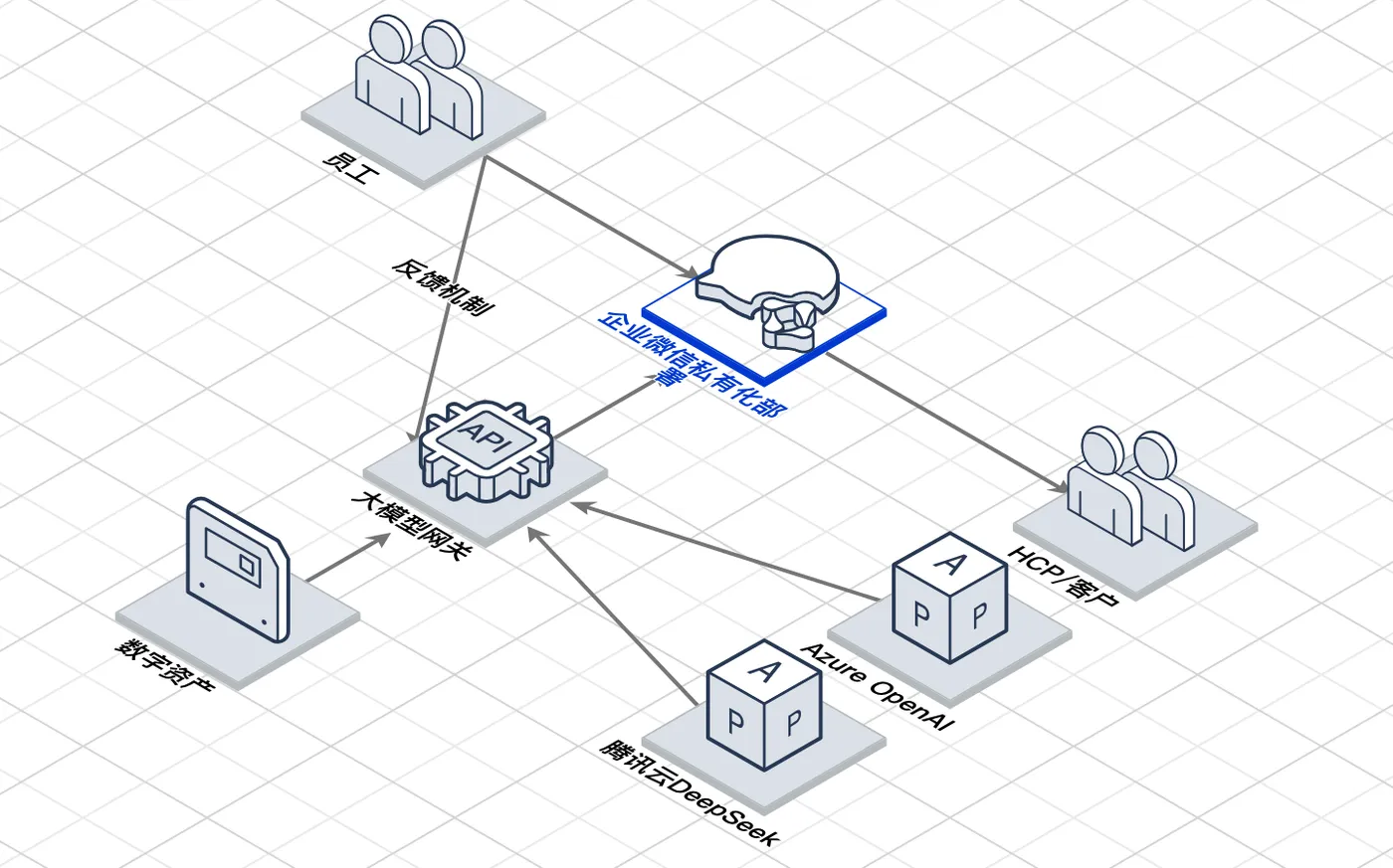 我们的 AI 转型以企业微信私有化部署为首要举措。选择这一方案的核心逻辑的是:企业微信生态天然适配私域流量运营,员工可通过企业微信接入内部信息化生态,同时便捷对接客户与医疗保健专业人士(HCP);加之腾讯企业微信支持私有化部署,能充分保障制药行业敏感数据的安全性与合规性。