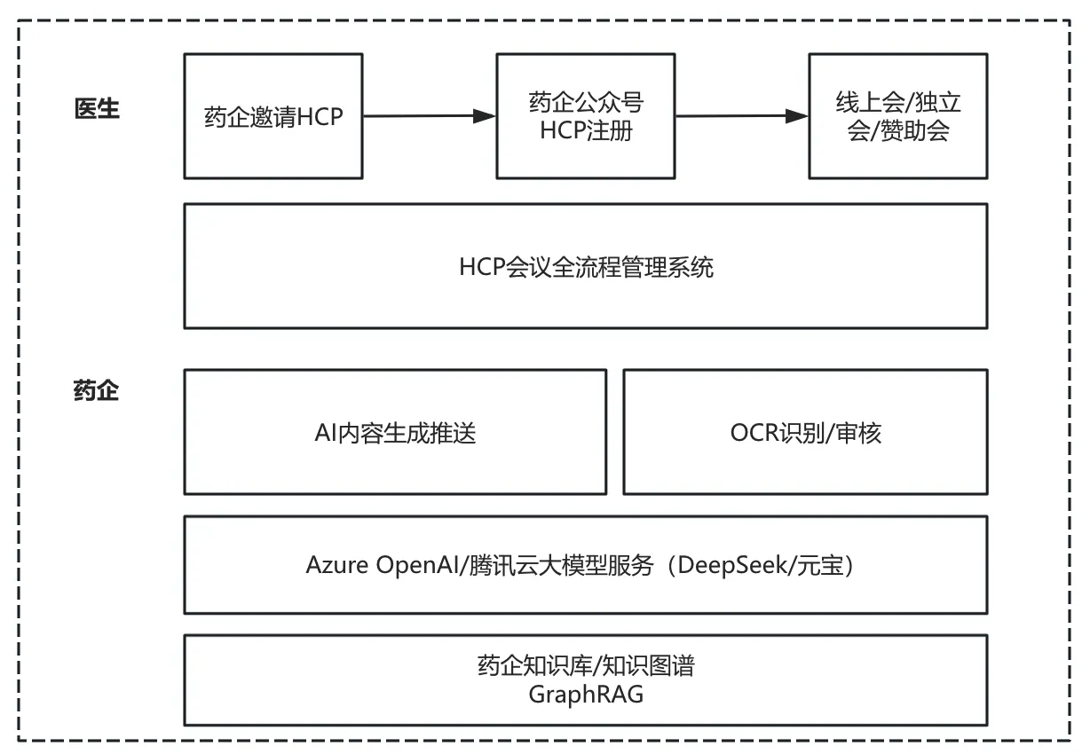 HCP 注册公众号后可参与线上会、独立会、赞助会等活动,AI 在会议全流程深度介入:
