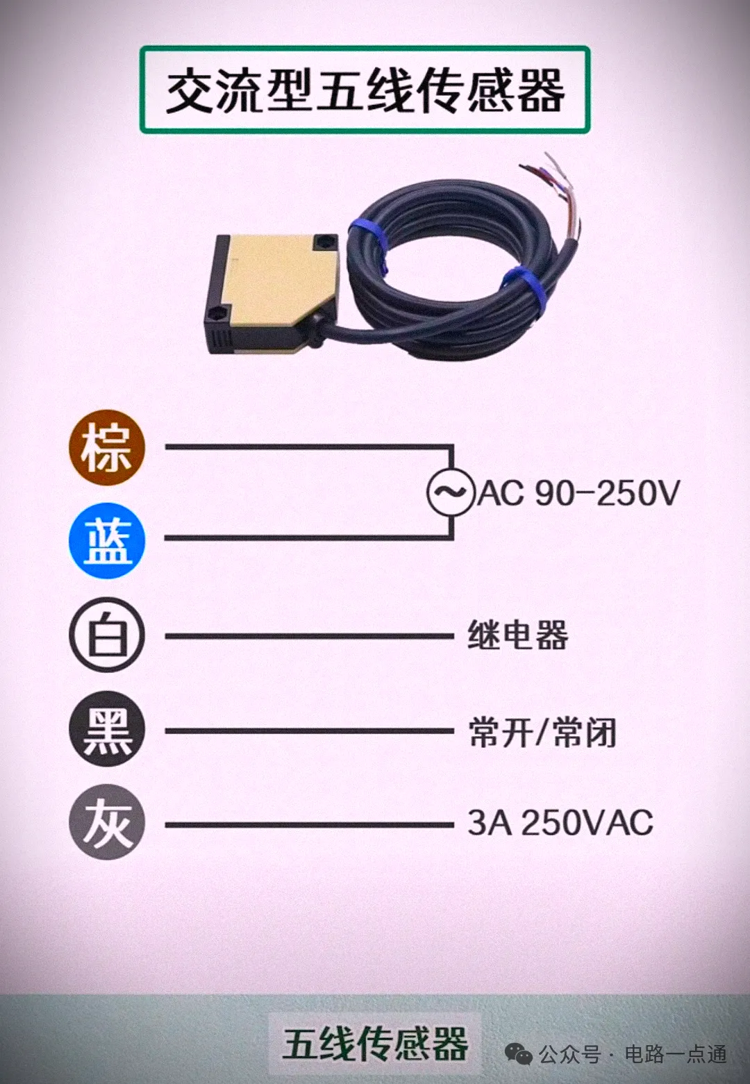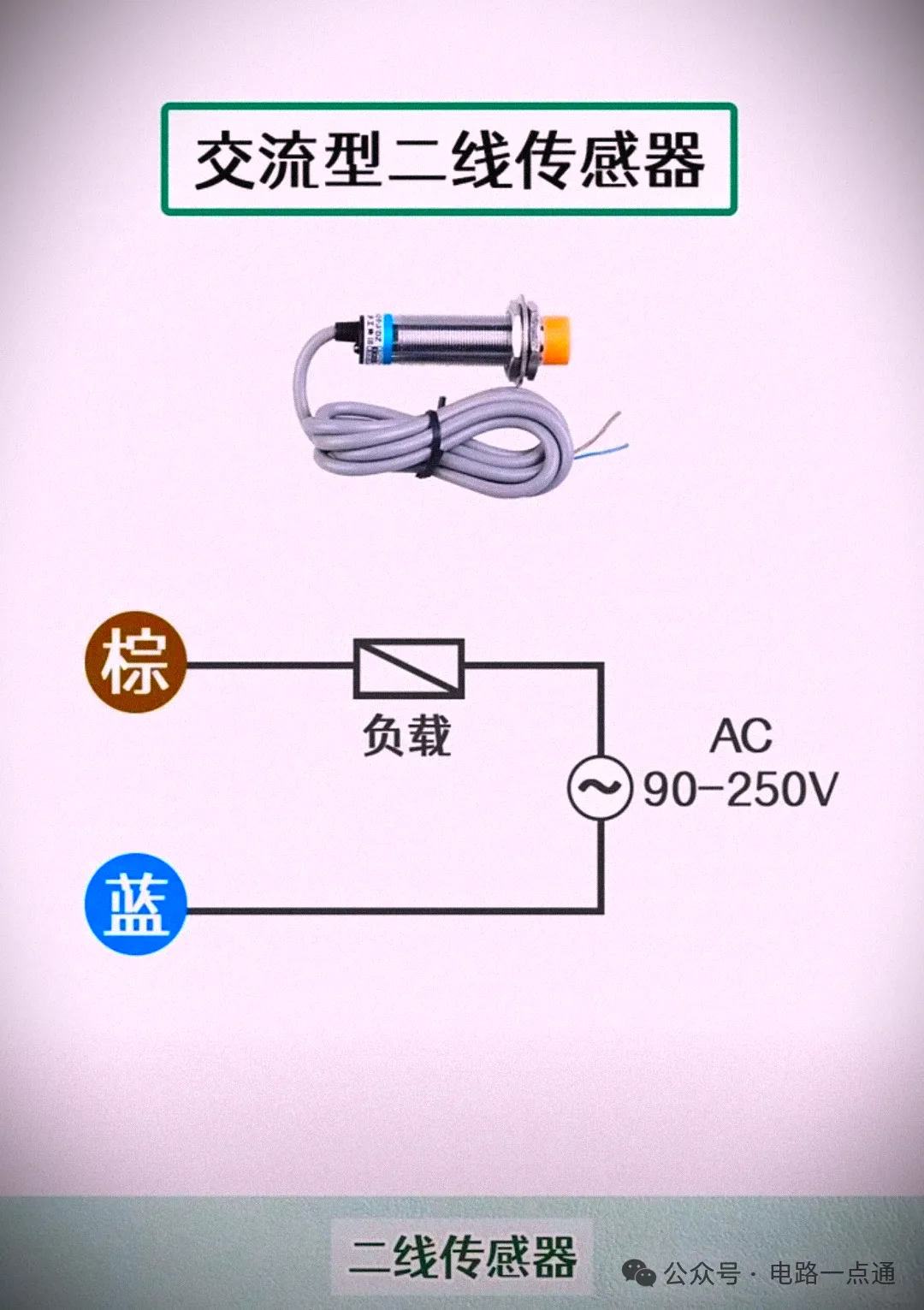 - 这种传感器通常一端接交流电源火线(L),另一端接负载,然后负载的另一端再接交流电源零线(N)。传感器工作时,通过内部元件的通断来控制电路的导通与截止,当满足检测条件时,传感器内部相当于闭合开关,使负载得电工作。