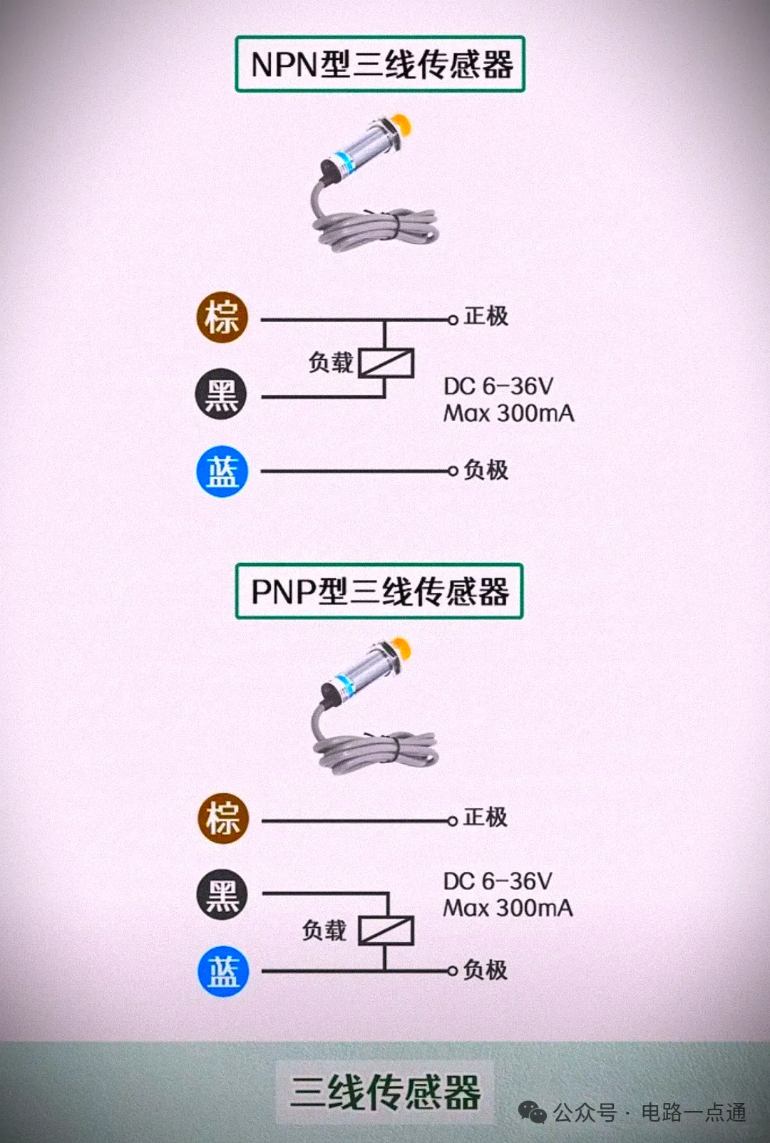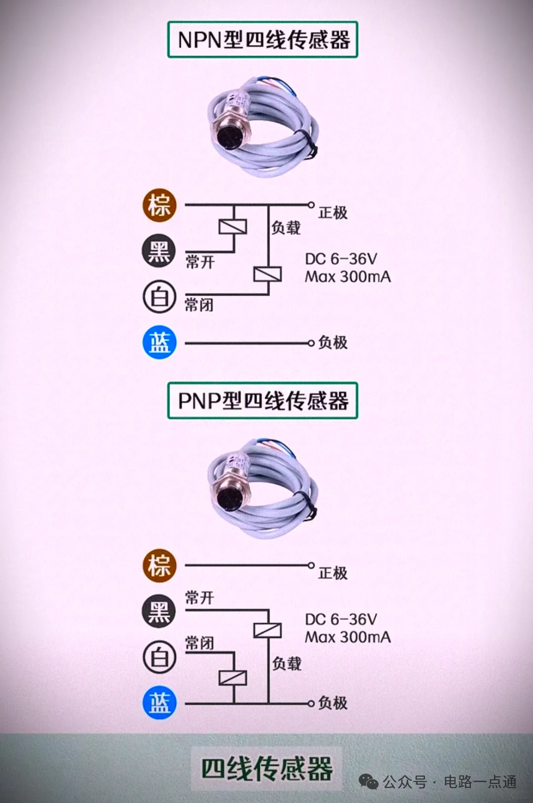 所谓传感器,可以看作一个感应开关,达到条件就接通正极或负极,接通负极叫NPN,接通正极叫PNP。