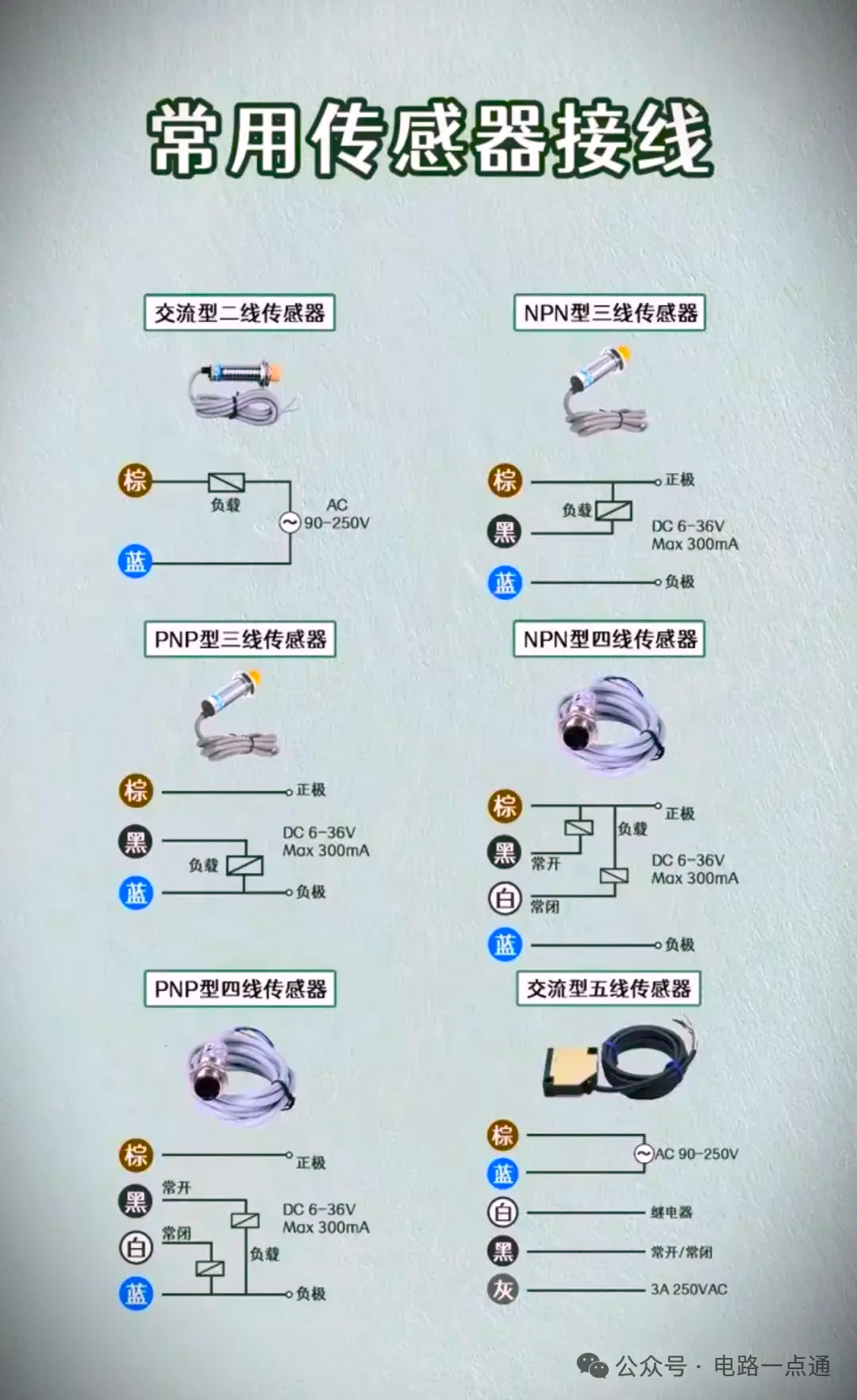 以下是交流型二线传感器、NPN 型三线传感器、PNP 型三线传感器、NPN 型四线传感器的接线方法: