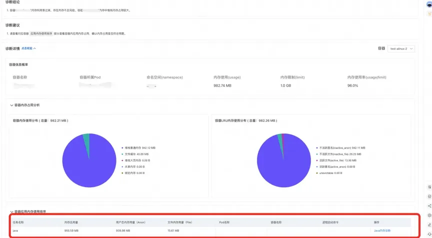 - 我们可以了解到当 Pod 中容器内存使用已经接近 limit,从诊断结论和容器内存占用分析中,我们可以看到容器内存主要是由于 Java 进程内存占用导致。