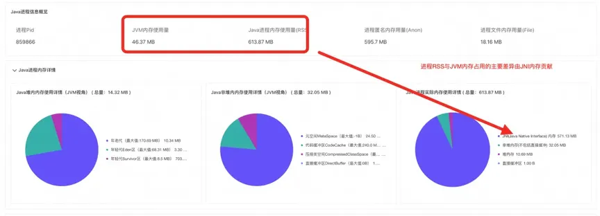 通过诊断结论和 Java 内存占用饼图我们可以发现,进程实际内存占用比 JVM 监控显示的内存占用大 570M,全都由 JNI 内存所贡献[4]。