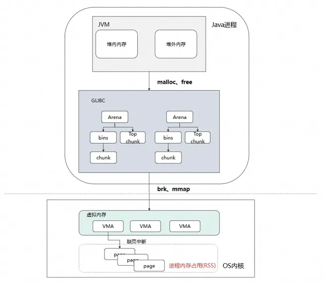 JVM 向 OS 申请内存的中间,还存在着一层中间层 -C 库,JVM 调用 malloc、free 申请/释放内存的过程中其实还要经过这一个二道贩子;以 gibc 中默认的内存分配器 ptmalloc 为例 glibc 的 ptmalloc 内存分配器存在以下特征: