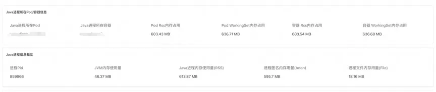 对 Java 进程发起内存分析,查看诊断报告。报告展示了 Java 进程所在 Pod 和容器的 rss 和 WorkingSet(工作集)内存信息、进程 Pid、JVM 内存使用量(即 JVM 视角的内存使用量)、Java 进程内存使用量(进程实际占用内存),进程匿名用量以及进程文件内存用量。