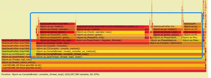 - 从内存分配火焰图中,我们可以看到主要的内存申请为 C2 compiler 正在进行代码 JIT 预热;
