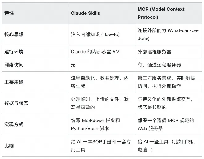- Claude Skills 是一种基于文件系统的、可复用的知识包,运行在 Claude 的沙盒虚拟机(VM)环境中,用于向 Agent 注入流程化、确定性的内部知识(SOP)的标准化方案。