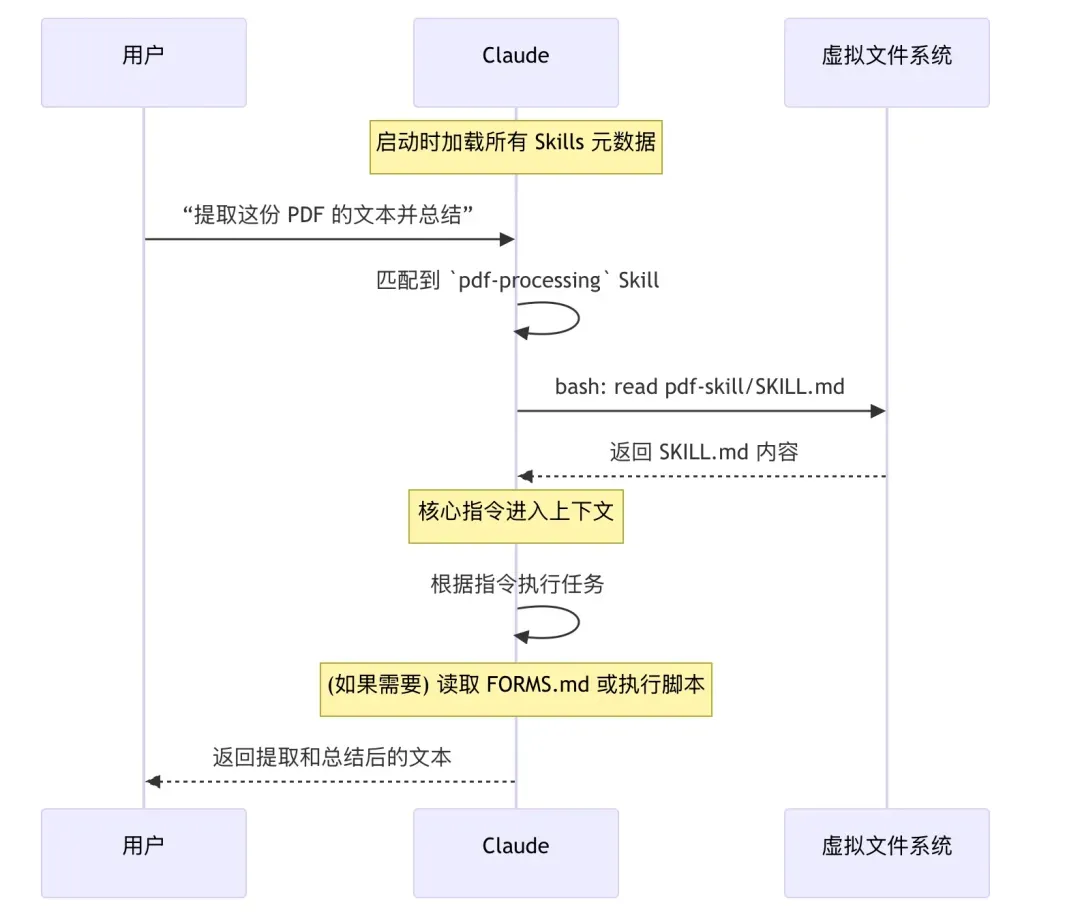 只有在这个时候,Skill 的核心指令和工作流程才会进入上下文窗口。Claude 开始学习如何完成这项具体任务。
