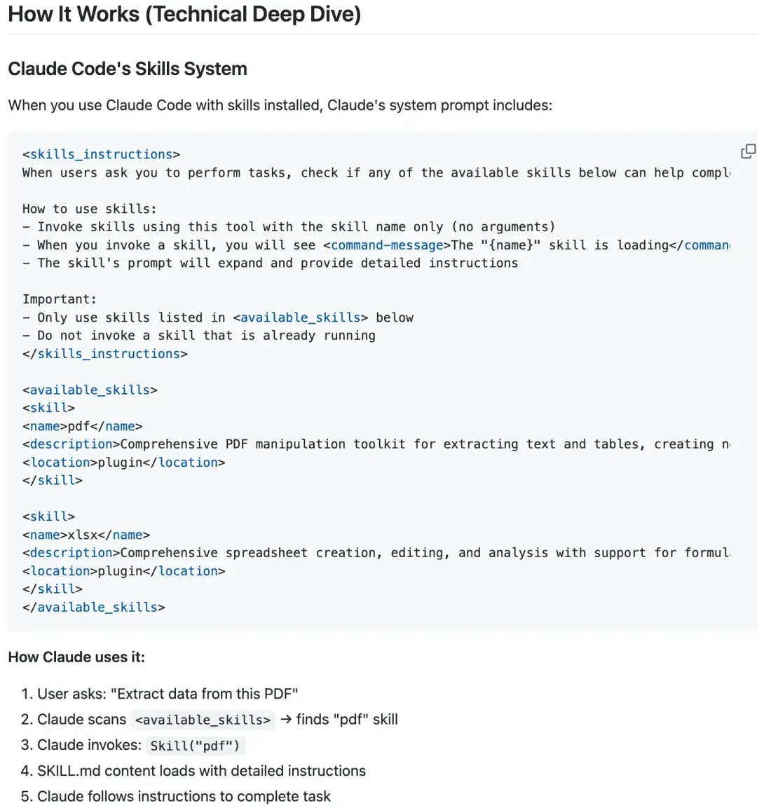 当 Claude 发现某个 Skill 与当前任务相关时,Claude 会使用 Bash 工具阅读 `SKILL.md` 文件的主体内容,例如: