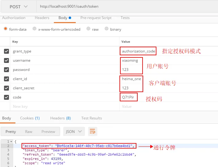 使用授权码到服务器申请通行令牌token