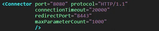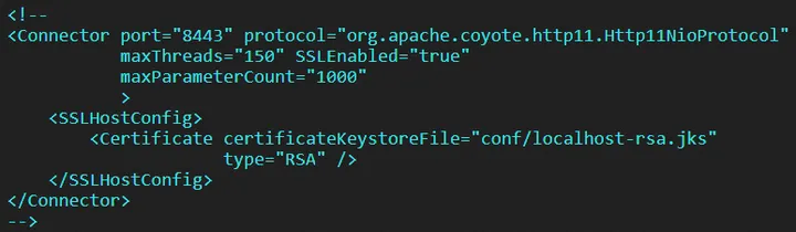 <Connector port="443" protocol="org.apache.coyote.http11.Http11NioProtocol" maxThreads="150" SSLEnabled="true" maxParameterCount="1000"> <SSLHostConfig> <!-- conf/domain_name.jks请您替换为证书的实际路径,证书密码替换为证书密码文件jks-password.txt中的内容 --> <Certificate certificateKeystoreFile="conf/domain_name.jks" certificateKeystorePassword="证书密码" type="RSA"/> </SSLHostConfig> </Connector>