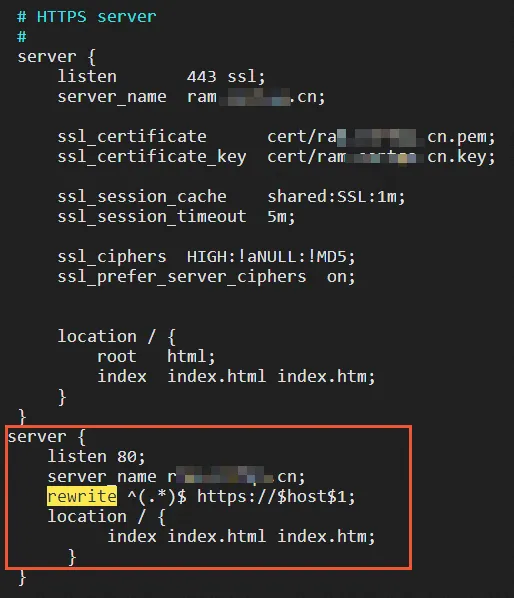 如果您希望所有的HTTP访问自动跳转到HTTPS页面,可通过rewrite指令重定向到HTTPS。