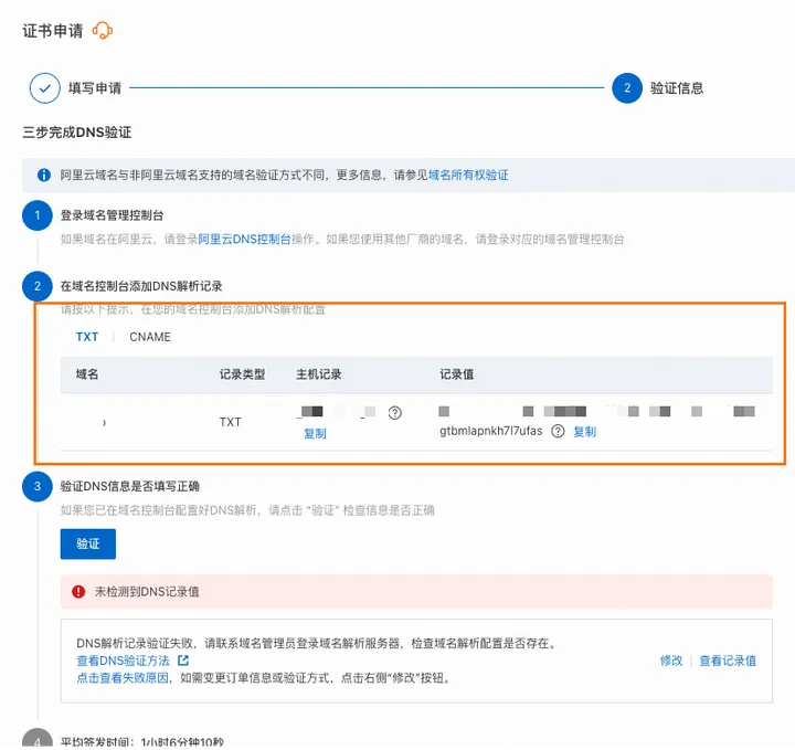 提交证书申请审核后,您需要在证书申请面板的验证信息引导页,获取验证授权验证类型、主机记录与记录值。