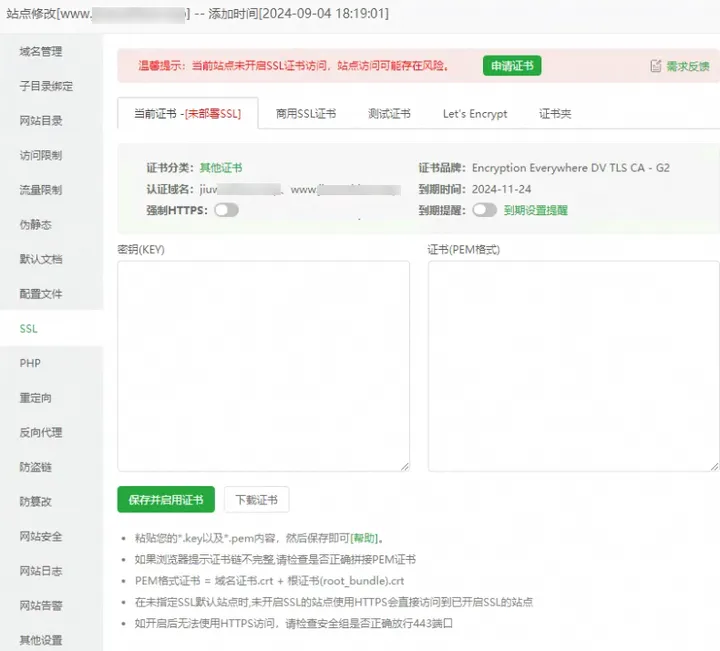 3,在本地使用文本编辑器打开证书文件(.pem)和私钥文件(.key),然后复制其内容并将其粘贴至相应位置,单击保存并启用证书