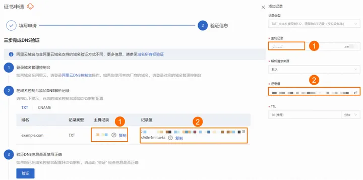 - TXT记录: 在DNS中为域名添加一条用于验证域名所有权的文本信息,该文本由阿里云生成。选择TXT记录,在每次申请证书时都需要在DNS中添加记录进行域名所权验证。