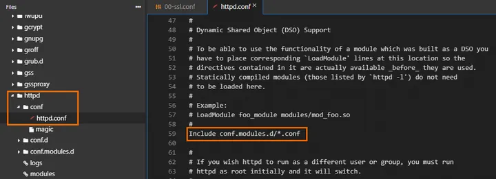 找到/etc/httpd/conf/httpd.conf文件,修改Include conf.modules.d/*.conf配置项,若前面有#号,需移除以取消注释,修改后保存文件