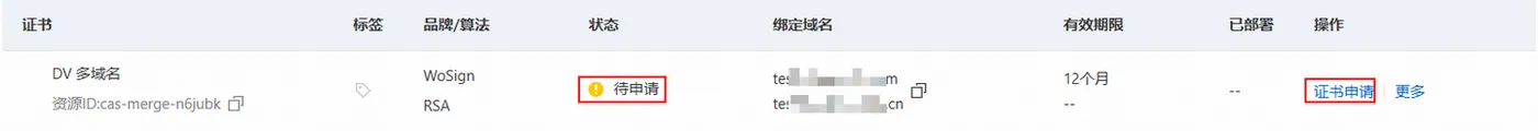 3,在正式证书页签,单击目标证书操作列的证书申请,或将鼠标悬停在目标证书状态列的