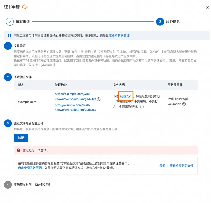 DV证书绑定的域名为单域名(http://aliyundoc.com)时,支持文件验证方式。您在提交证书申请审核后,需要下载验证文件,然后将解压后的文件上传到站点服务器的指定验证目录(.well-known/pki-validation/)。CA中心将会依次尝试访问HTTPS地址和HTTP地址(443端口和80端口),验证是否可以访问到验证文件内容,验证通过后,将为您签发证书。