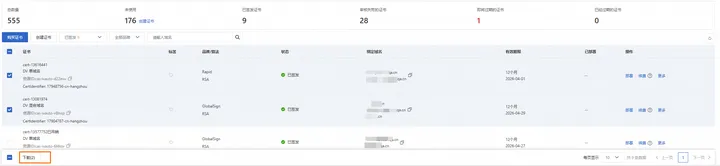 - 在正式证书或个人测试证书(原免费证书)页签,选中需要下载的证书,在证书列表左下方单击下载。