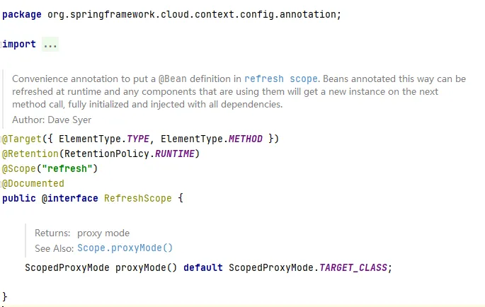 所以截止目前我们可以了解到:@RefreshScope注解本身是一个组合注解,其实现配置热更新的关键是依赖@Scope("refresh")。我们进一步来看看@RefreshScope到底做了什么?