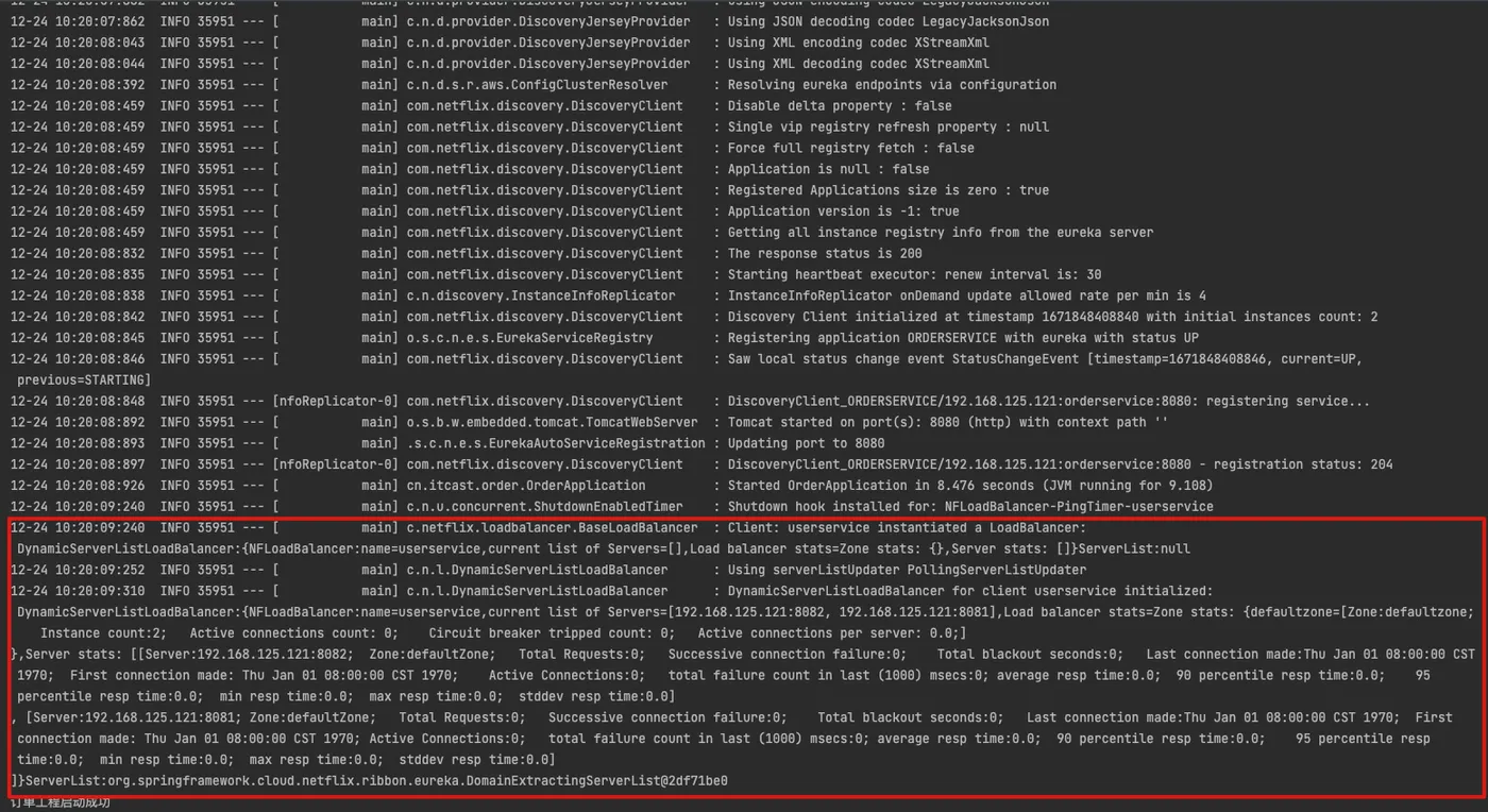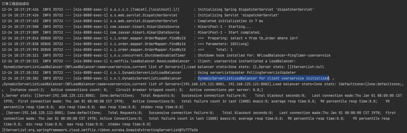 在上述的测试中不知是否有读者发现:当请求第一次到某个实例时,其响应速度明细要慢一点,这里就是因为Ribbon默认采用饥饿加载,只有访问时才会创建LoadBalanceClient,从而导致第一次时间要长点,日志如下: